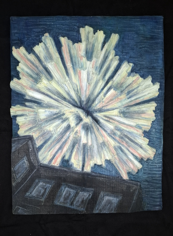 Karin Frank, Harstad, 2025 Interpretation einer Sichtung am 17.09.2025, 00:30 in Harstad, Norwegen / Interpretation of an event on Sept 17, 2025 00:30 in Harstad, Norway. Holzrelief, farbig gefasst / painted. 40 x 50 cm. |